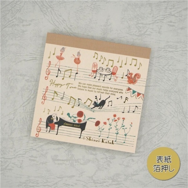 ブロックメモ セレナ—デ Happy Tone 文具 日本製 (BM-01053) Shinzi Katohが描く、音楽がテーマの新シリーズ「Happy Tone」 ピアノや楽器を演奏する動物や子どもたちが描かれた、温かみのある可愛らしいデザインです ふんわりとした色使いが、気持ちまでやさしく包み込みます 4種類の異なるデザインは、使うたびに違った可愛さが楽しめます メモや伝言、ちょっとしたメッセージにピッタリのアイテムです <サイズ・規格等> ■90mm×90mm 100枚綴り(25枚×4柄) ■表紙:箔押し ■生産地:【Made in Japan】 ■素材・成分:紙 ■パッケージ:個包装 <ご注意ください> ★サイズは平置き採寸ですので若干の誤差が生じる場合がございます。 ★PC環境と光の具合により、色や素材のイメージが写真と若干異なる場合がございます。 ★プレゼント用等に、当店在庫数以上に大量注文される場合は、トップページのコンタクト(CONTACT)タブより、商品名と希望数量、ご希望納期などをご連絡ください。仕入れ先に在庫確認後、在庫数量を一時的に増やしてご注文をお受けできるようにしてからメールにてご連絡致しますので、ご注文願います。(仕入れ先の在庫状況によってはご希望数量・納期に応じられない場合もございます。ご了承願います)