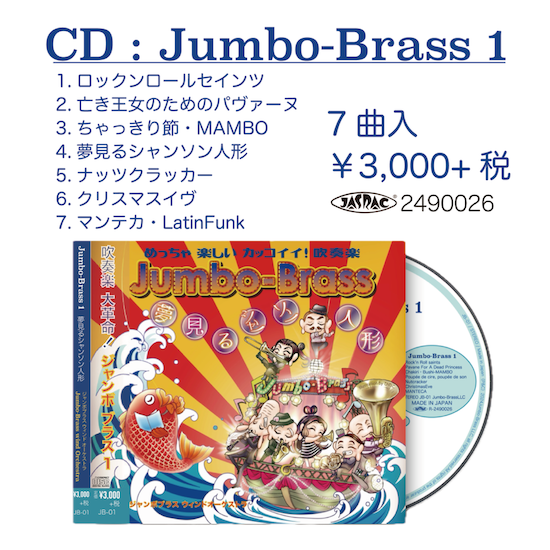 当CD「Jumbo-Brass 1」は、豪華な吹奏楽演奏をお届けする作品です。以下の楽曲が収められております。