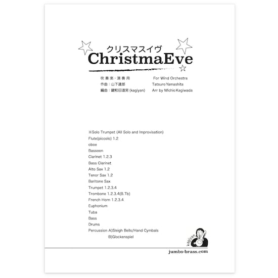 クリスマスの定番曲です。ヒット曲定番コード進行(1maj→5(7th)→6m7→5(7th)→4maj→3m7→2m7→4maj/5)ベースラインが(ドシラソファミレソ)が繰り返されます。今回はアレンジ的に原曲のフレーズに対し「色々なスタイル」でアプローチしていて面白い仕上がりになりました。オリジナルイントロの「マーチングスタイル」から「オリジナルのブラスコラール」へ(これはクリスマス救世軍社会鍋のブラスコラールをイメージしています)テーマへ入ってからのバッキングは「メローなファンク」になり→サビへ「ハリウッド映画的!」なサビへ続きます。1コラス後に転調し、木管群のコラール(定番コード進行)になり→Tpトリオへ(3名はステージセンターでカッコ良く!)そして、クリスマスを祝う「象徴的」な8小節のファンキーなブリッジ(間奏)が有り、締めくくりはトランペットアドリブソロです。