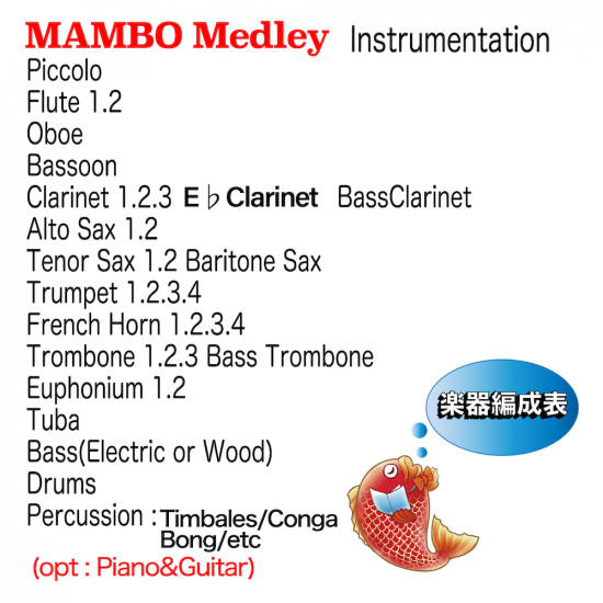 元になる演奏には、実績豊富な「東京パノラマ マンボ ボーイズ」が惹き付ける音色が響き渡ります。彼らの情熱的な演奏スタイルが、この楽譜にさらなる魅力を加えています。楽しく爽快なマンボのリズムに乗って、演奏会を盛り上げましょう!