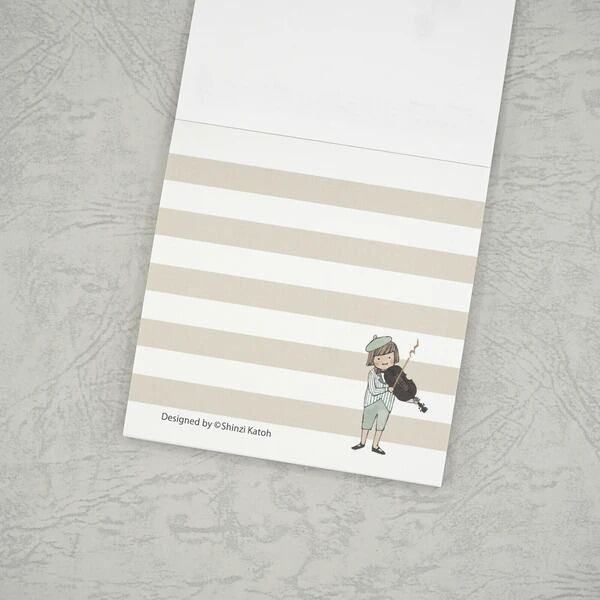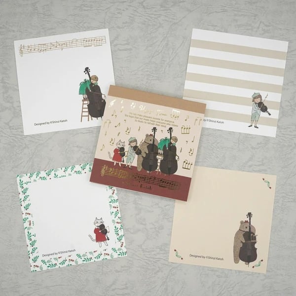 ピアノや楽器を演奏する動物や子どもたちが描かれた、温かみのある可愛らしいデザインです