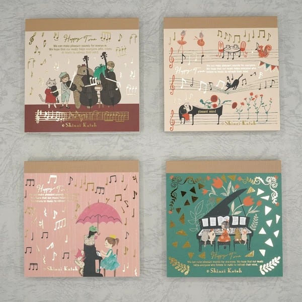 ピアノや楽器を演奏する動物や子どもたちが描かれた、温かみのある可愛らしいデザインです