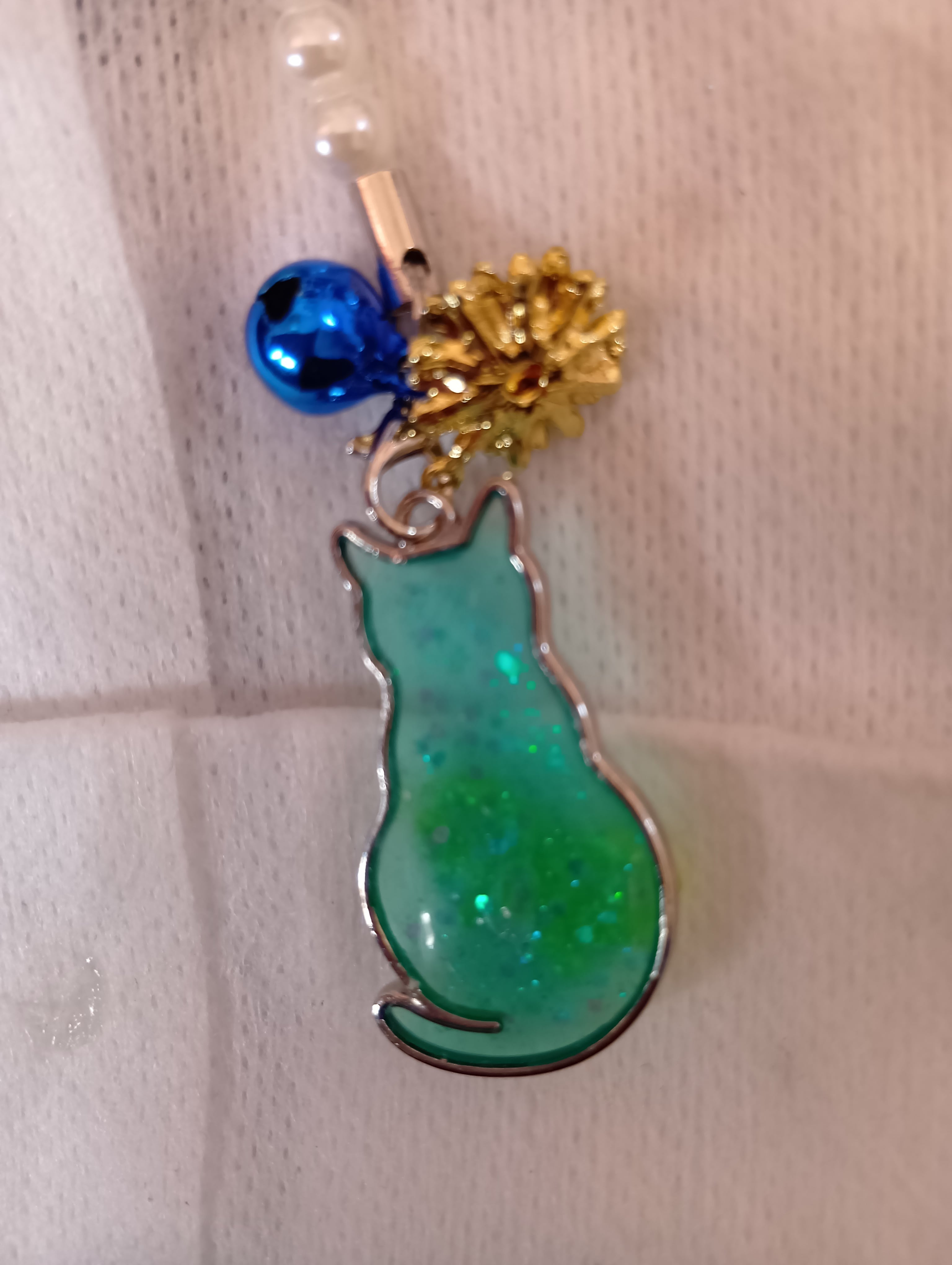 ひとちゃん作 猫ちゃんストラップ(チャーム) 『リボン付き銀色』 (緑色)